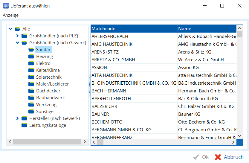 Lieferant auswählen. Im linken Bereich des Fensters können wir die Auswahl eingrenzen.