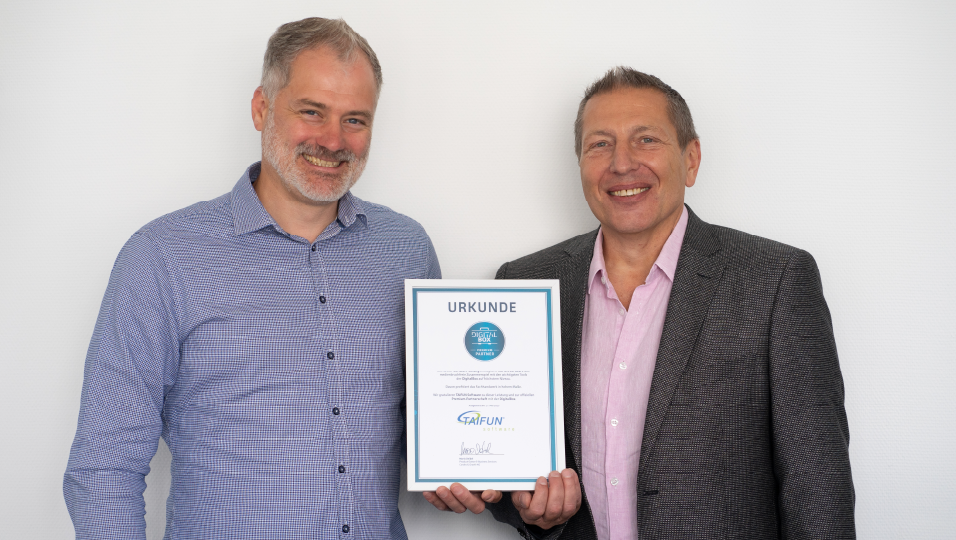 TAIFUN ist sehr stolz darauf, verkünden zu können, dass wir die hohen Anforderungen und Wünsche der GC-Gruppe erfüllt haben. Als Zeichen ihrer Anerkennung und als Beweis für unsere enge Partnerschaft wurde uns von Mario Deibel und Lars Oberländer der Status eines Premium-Partners verliehen. Entgegen genommen wurde diese Auszeichnung von Geschäftsführer Holger Studtmund und Schnittstellen-Entwickler Ingo Stroech.