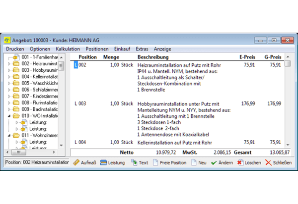 In Zusammenarbeit mit der Firma EDS-Klein bietet TAIFUN jetzt Fachbetrieben aus der Elektrobranche einen Datenkatalog mit über 165.000 Artikel- und 17.000 Leistungspositionen. Alle notwendigen Daten wie Bruttopreise, Rabattgruppen, Maßeinheiten, Kalkulationsgruppen, Kupferwerte und sogar zwei verschiedene Lohnzeiten sind darin enthalten. Das Besondere: TAIFUN Handwerk und der Leistungskatalog arbeiten perfekt zusammen.
