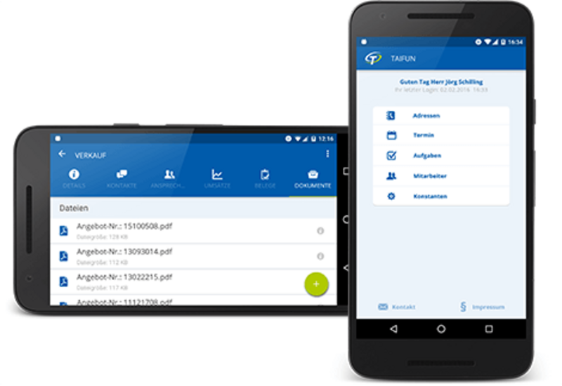 Bereits seit längerer Zeit für iOS-Geräte erhältlich, haben unsere Entwickler für Sie fleißig an einer Android-Version gearbeitet. Ob schnell mal einen Ansprechpartner suchen, Kontakte unterwegs zwischen den Terminen festhalten oder die aktuellen Umsätze prüfen: Ab sofort können Sie auch mit Ihren Android-Geräten auf Adressen, Termine, Dokumente u.v.m. aus Ihrem TAIFUN zugreifen.