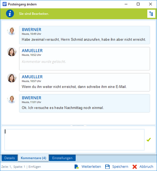 Zu Posteingängen können nun Kommentare hinzugefügt werden. Jeder Benutzer, der Zugriff auf einen Posteingang hat, kann Kommentare lesen und hinzufügen, auch ohne den Posteingang anzunehmen. So können Sie z. B. mögliche Unklarheiten zuerst beseitigen, bevor der Posteingang von einem Bearbeiter angenommen wird.