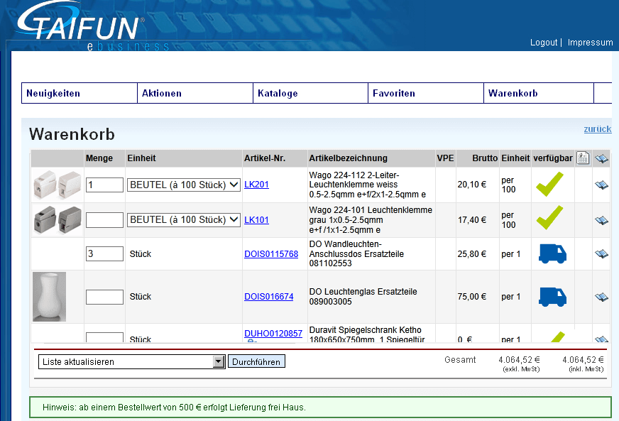 Erstellen Sie Angebote, Aufträge und Bestellungen künftig viel schneller durch Übernahme von Warenkorb-Artikeln aus dem Webshop Ihres Großhändlers in Ihren TAIFUN-Beleg! Einfach aus der Position oder aus dem Artikelstamm heraus aufrufen!