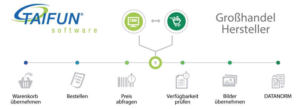 Und das Beste: DATANORM ShopConnect vereint diverse Shop-Schnittstellen, wie IDS-Connect, OCI, SCT-Schiele unter einem Dach und ist serienmäßig in TAIFUN integriert.