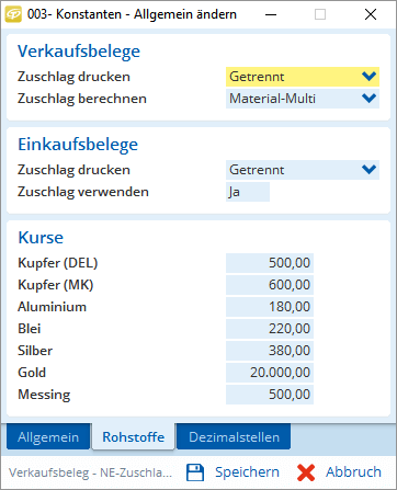 Zu jedem Artikel können Sie Rohstoffanteile für Kupfer, Alu, Gold, Silber, Blei und Messing erfassen.