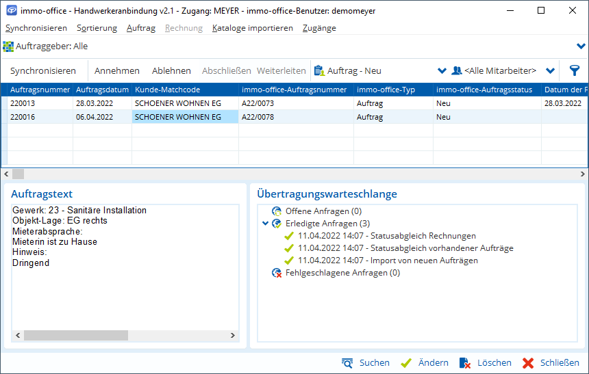 Mit TAIFUN ImmoConnect können Sie Aufträge importieren und mit den eigenen Stammdaten bearbeiten. Die Auftragsübersicht verschafft Ihnen einen genauen Überblick über die Aufträge und ihren Status.