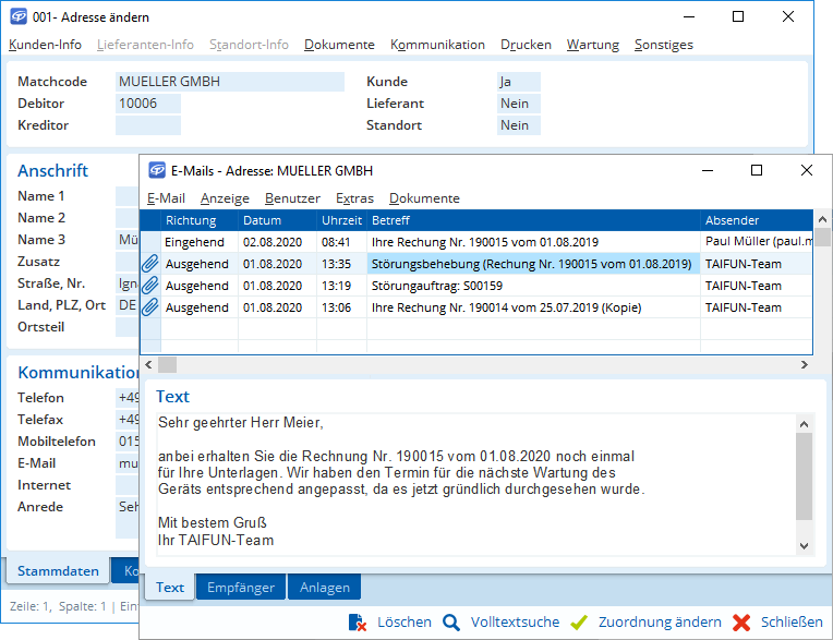 Als Anwender von TAIFUN Handwerk, Handel oder openBusiness sehen Sie die E-Mails kundenbezogen in Ihrem TAIFUN.
