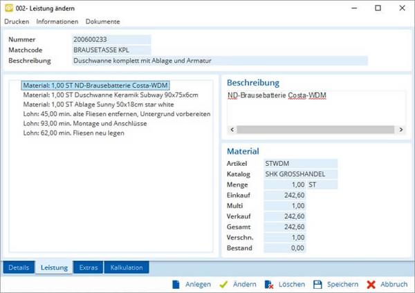 Die Kombination aus Material, Lohn und Kostenarten definiert eine Leistung vollständig. Die Zuordnung von Material zu Artikeln aus den Stammdaten ist ein unabhängiger Schritt. Sie können Leistungen nach Bedarf neu definieren, ergänzen, anpassen usw., ohne sie selbst und ihre Beschreibung ändern zu müssen.