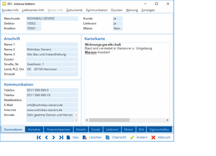 TAIFUN Handwerk verwaltet Ihre Kunden, Lieferanten, Mieter/Standorte und sonstigen Adressen in einer einzigen Datei. Ob eine Adresse als Kunde und/oder Lieferant geführt wird, entscheiden Sie. Debitoren- und Kreditorennummern vergibt das Programm automatisch, wo sie gebraucht werden. Mieter/Standorte können Sie sofort einem Kunden zuordnen.
