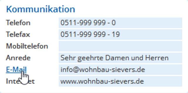 Telefonieren, faxen oder mailen können Sie direkt aus TAIFUN Handwerk heraus: Klicken Sie auf die Nummer oder E-Mail-Adresse – und los geht’s.