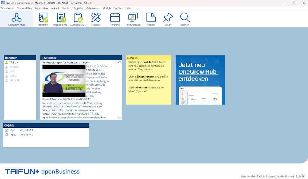 Der OneQrew Hub ist die perfekte Ergänzung für TAIFUN+ und unterstützt Sie in allen Bereichen Ihres Arbeitsalltags. Von der Recherche bis hin zur Kundenberatung vor Ort – alles wird einfacher, schneller und effizienter. Der OneQrew Hub – Ihre All-in-One-Lösung für nahtlose Arbeitsprozesse. Jetzt mit TAIFUN+ verbinden und Zeit sowie Ressourcen sparen!