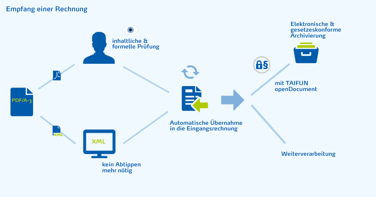 Und noch ein Vorteil: Während der Empfänger die Rechnung im PDF-Format überprüft, liest TAIFUN die angehängte XML-Datei ein und übernimmt sie automatisch in die Buchhaltung – einfach und bequem.