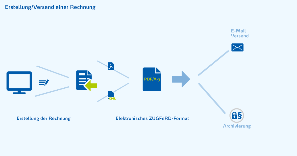 ZUGFeRD ist eine branchenübergreifende Spezifikation für den Austausch elektronischer Rechnungen und steht für „Zentraler User Guide des Forums elektronische Rechnung Deutschland“. ZUGFeRD ist das erste Rechnungsformat, dass nicht auf eine bestimmte Unternehmensgröße ausgerichtet ist und von vielen Softwareherstellern unterstützt wird. Egal ob 1-Mann-Betrieb oder Mittelstand, egal, wie viele Rechnungen Sie empfangen und verschicken – ZUGFeRD lohnt sich, vor allem, weil das Datenformat den rechtlichen Anforderungen entspricht.