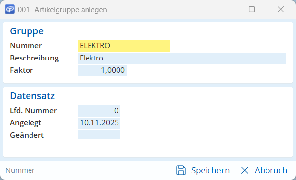 Die Artikelgruppe wird angelegt, z. B. ELEKTRO - Elektro.