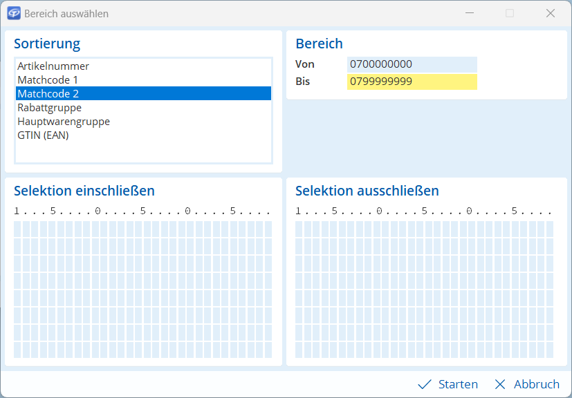 Sie können eine Auswahltreffen. Artikel, die bestimmte gemeinsame Werte haben, können Sie gesammelt einer Artikelgruppe zuordnen. Wenn z. B. bei allen Kabeln im ausgewählten Artikelkatalog der Matchcode 2 neun Zeichen lang ist und mit den Ziffern 07 beginnt, können Sie diesen Bereich auswählen.