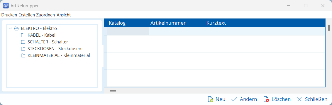 Das Fenster Artikelgruppen wird geöffnet und ist zunächst leer.