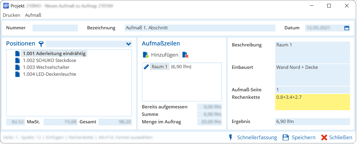 - Speichern und schließen den Aufmaßbeleg.