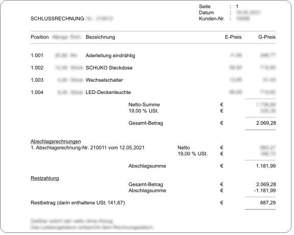 Hinweis: Die Abschlagssumme der 1. Abschlagsrechnung wird aufgeführt und vom Gesamtbetrag abgezogen, da sie bereits in Rechnung gestellt wurde.