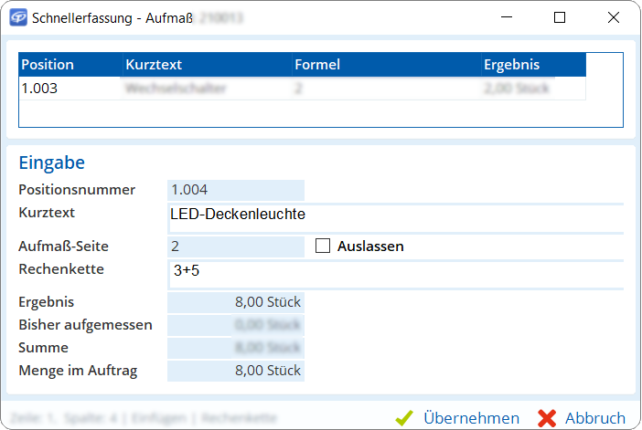 das Feld Formel der nachfolgenden Position.Hinweis: Das Feld Beschreibung wird bei der Schnellerfassung ignoriert. Falls nötig, können Sie die Beschreibung über die Aufmaßzeilen nachtragen.