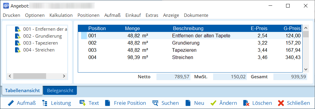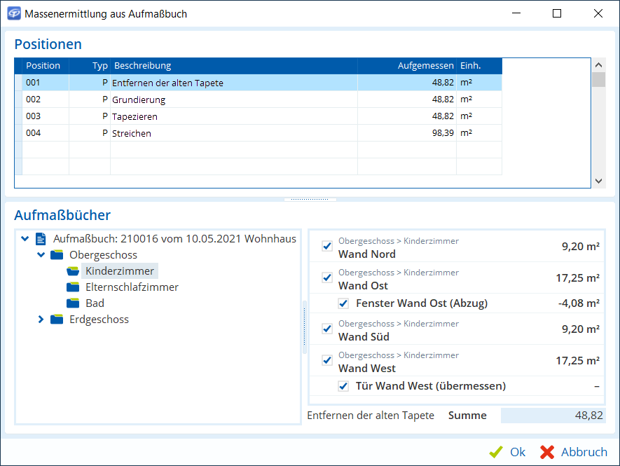 Massenermittlung aus Aufmaßbuch - Wählen Sie im Bereich Positionen die erste Position (z. B. Entfernen der alten Tapete).