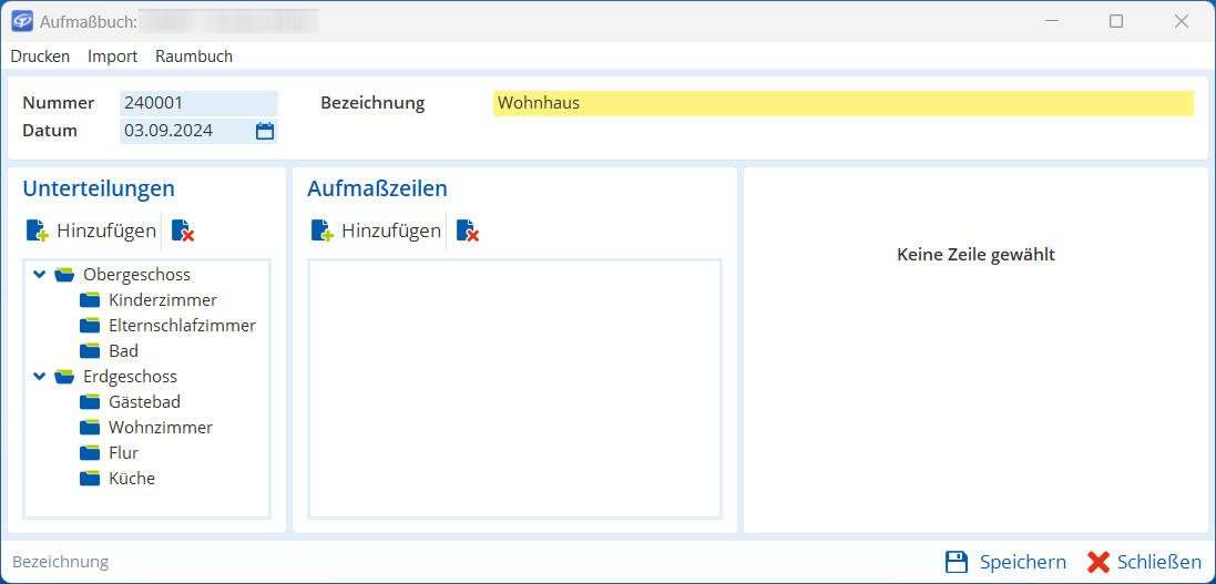 - Wählen Sie im Bereich Aufmaßbuch die entsprechende Zeile, (z. B. Kinderzimmer).