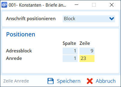 Speichern.Konstanten für Briefe: Position der Anschrift und Anrede im Brief
