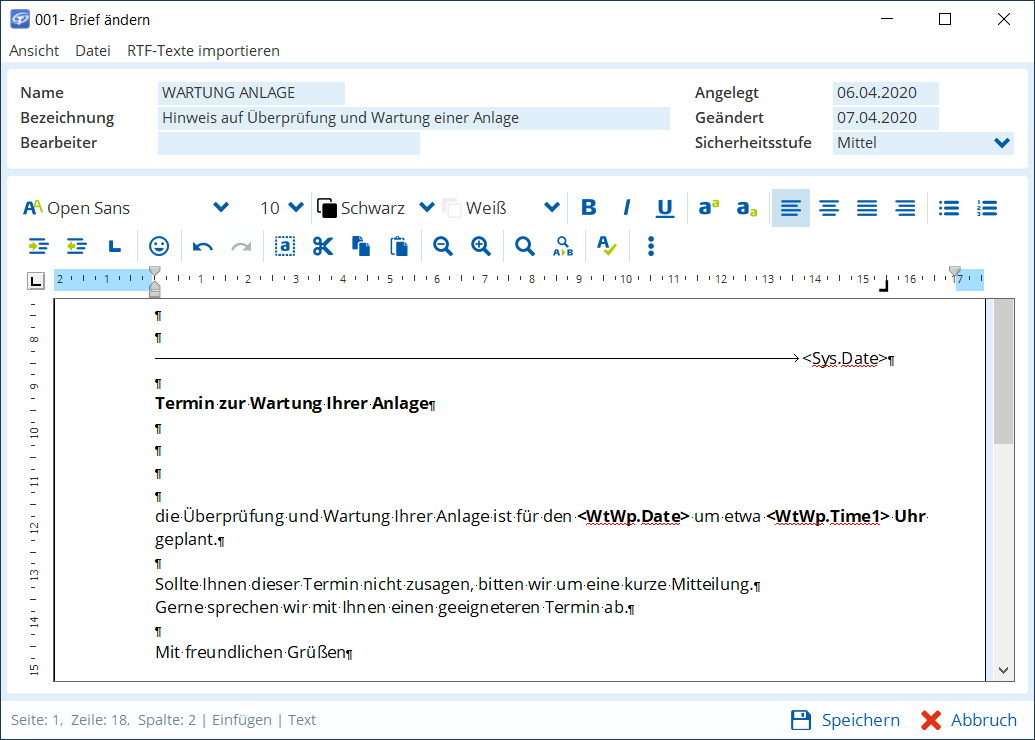Ein Brief mit darin verwendeten Variablen <WtWp.Date> und