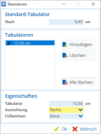 Hinzufügen einen neuen rechtsbündigen Tabulator bei 15,50 cm ein. Bestätigen Sie mit der