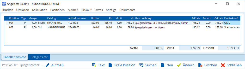 Jetzt können wir Positionen für benötigte Kleinteile einfügen, das Angebot nochmal prüfen und das Angebot an den Kunden senden.