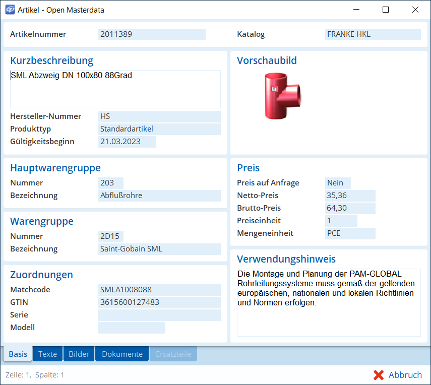 Wir benötigen für einen Störungsauftrag zur Reparatur eines Gebäudeentwässerungssystems einige Ersatzteile, darunter ein SML-Abzweigrohr. Bei Open Masterdata wird im Gegensatz zu DATANORM nicht mehr der komplette Artikelstamm vorsorglich in TAIFUN importiert, sondern wir holen uns nur die Artikel, die wir wirklich benötigen, nach Bedarf in unser TAIFUN. Daher suchen wir das SML-Abzweigrohr nicht in unserem Artikelstamm, sondern direkt in der Artikeldatenbank des Großhändlers Franke HKL.