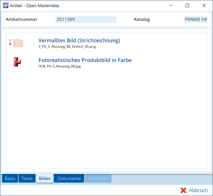 Bilder aus Open Masterdata. Diese Bilder werden direkt von Open Masterdata zur Verfügung gestellt. Wir können sie aber – ebenso wie Dokumente – lokal speichern.