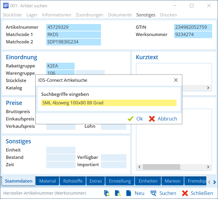 Als nächstes wählen wir den Menüpunkt Sonstiges > Artikelsuche über IDS-Connect. In das Suchfenster geben wir SML Abzweig 100x80 88 Grad ein.