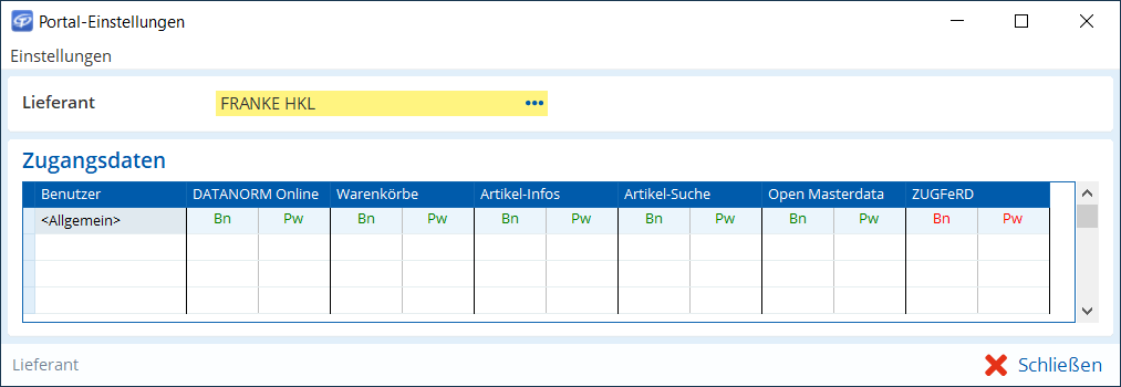 Fenster Portal-Einstellungen. Die Zugangsdaten für Open Masterdata sind korrekt. Beim Großhändler Franke HKL gelten die gleichen Zugangsdaten auch für weitere Dienste wie DATANORM Online und Warenkörbe.