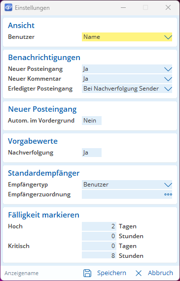 Das Fenster Posteingang anlegen wird geöffnet. Einige Felder sind bereits ausgefüllt.