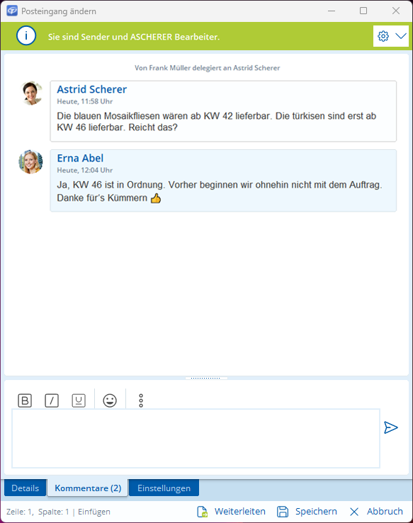 Sie können einen Posteingang kommentieren, um sich über die Aufgabe auszutauschen, z. B. durch Nachfragen. Kommentare können Sie auch schreiben, wenn der Posteingang von einem anderen Benutzer geöffnet und dadurch gesperrt ist.