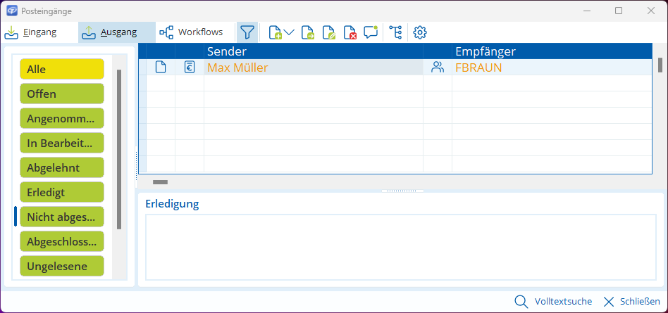 Über die Filterleiste können Sie z. B. nach Posteingängen filtern, die den Status Nicht abgeschlossen aufweisen. Nur die Posteingänge werden angezeigt, die offen, angenommen oder in Bearbeitung sind.