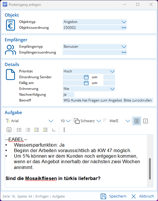 Das Fenster Posteingang anlegen wird geöffnet. Das Angebot ist als Objekt verknüpft.