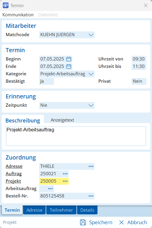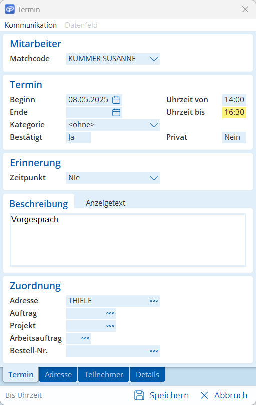 Aus einer Adresse angelegter Termin Im Bereich Zuordnung wurde die Adresse des Kunden automatisch eingetragen.