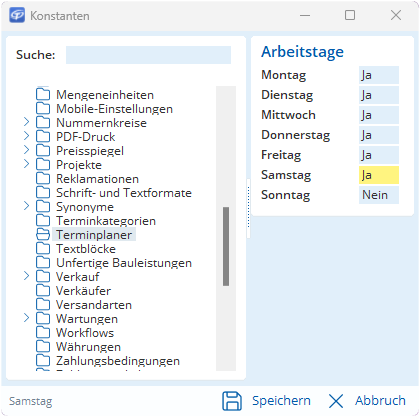 - Im Fenster Konstanten im Bereich Arbeitstage markieren Sie alle Wochentage, an denen Sie arbeiten (z. B. Montag bis Samstag) mit Ja.
