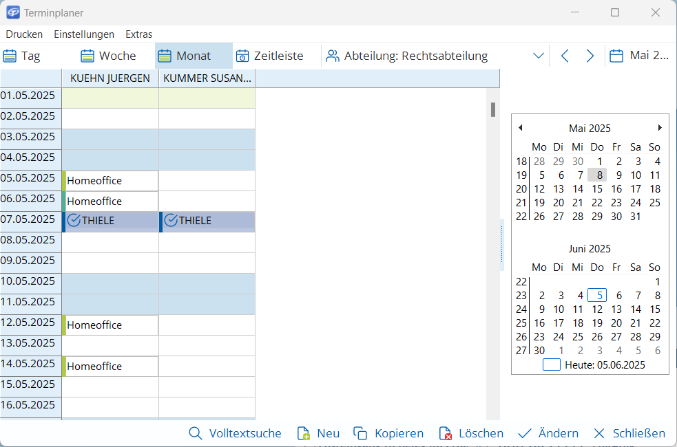 Die Kalender der gewählten Mitarbeiter werden im Terminplaner angezeigt.