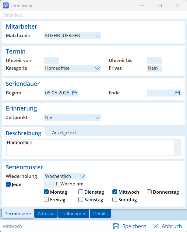 Arbeitet ein Mitarbeiter einzelne Tage im Homeoffice (z. B. Montag und Mittwoch) kann dies ebenfalls im Terminplaner eintragen werden. So können Kollegen einsehen, wo sie den Mitarbeiter erreichen können. Die Homeoffice-Tage werden als Terminserie angelegt.
