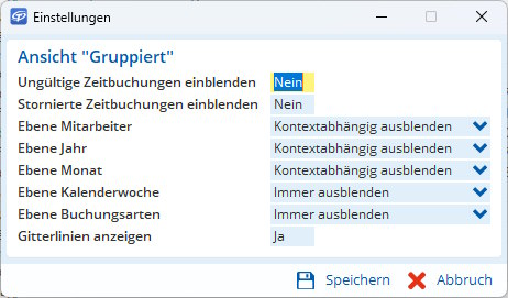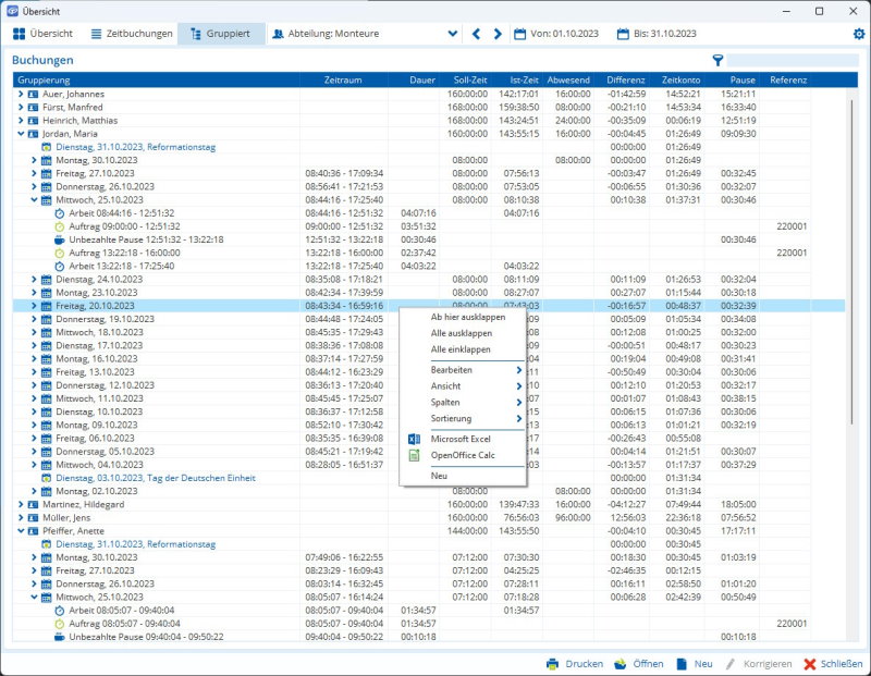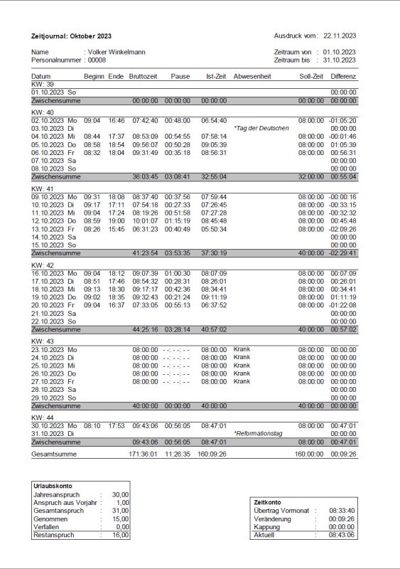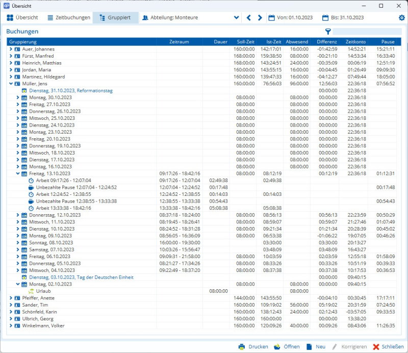 - In der Spalte Zeitraum wird auf Ebene der Kalenderwoche der erste und letzte Tag der enthaltenen Tage angezeigt, ohne die Woche aufklappen zu müssen. Auf Ebene des Tages werden dort Arbeitsbeginn und -ende angezeigt, ohne den Tag aufklappen zu müssen.