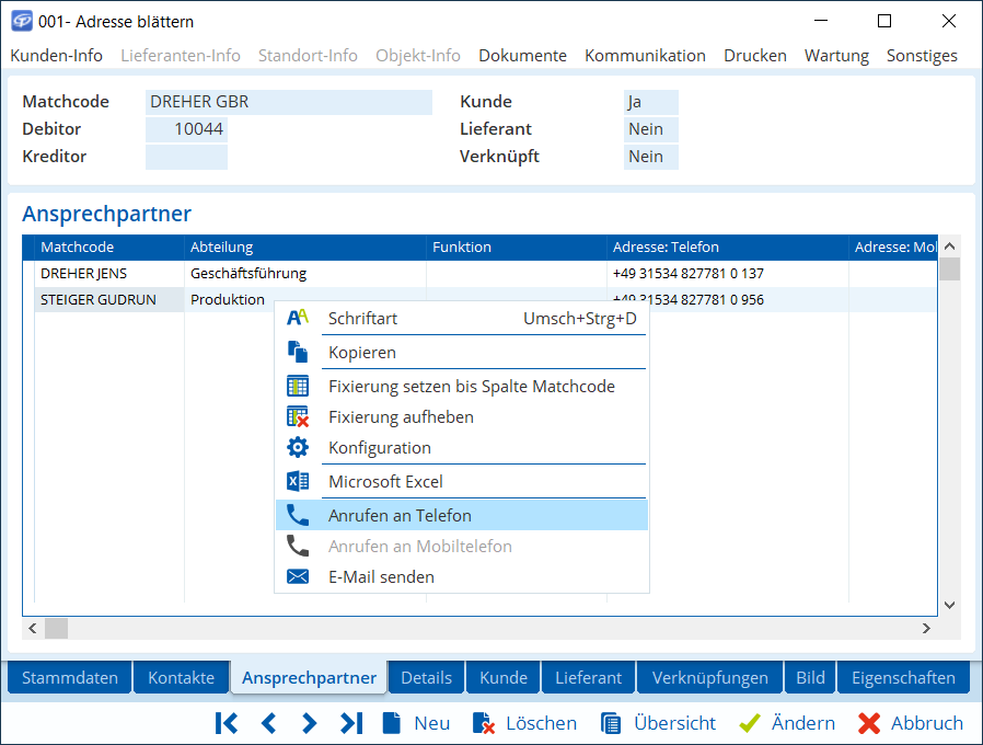 Sie haben nun die Möglichkeit in einer Adresse direkt im Blättermodus einen Ansprechpartner anzurufen oder ihm eine E-Mail zu senden. Dazu müssen Sie nur den gewünschten Ansprechpartner markieren und im Kontextmenü eine der entsprechenden Option auswählen: