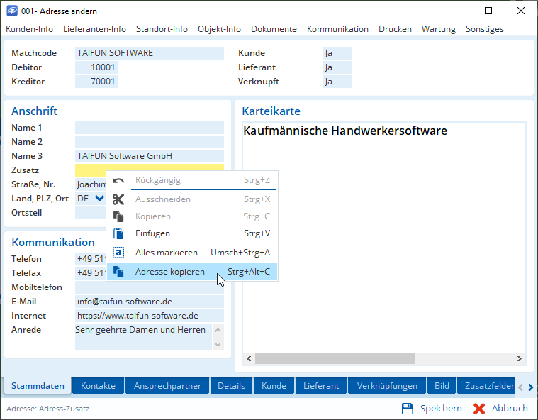 Sie können nun die komplette Anschrift in die Windows-Zwischenablage kopieren und an beliebiger Stelle als mehrzeiligen Text wieder einfügen. Kopieren ist hier nur im Ändern-Modus möglich.