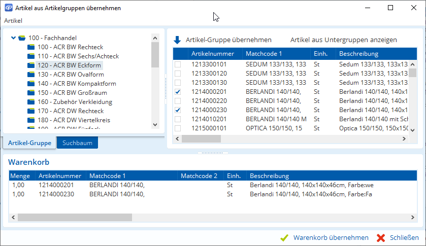 Info: Warenkörbe werden aus Artikel-Gruppen und/oder Suchbäumen in strukturierter Form zusammengestellt, wodurch sich die gesuchten Artikel leichter finden und von ähnlichen Artikeln in derselben Gruppe unterscheiden lassen. Sie können hierbei zwischen den beiden Varianten hin- und herschalten. Zum Auswählen der Artikel werden Ihnen Ankreuzfelder angezeigt.