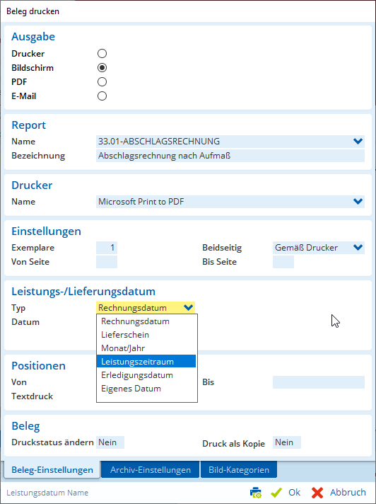 Beim Drucken einer Rechnung wird im Fenster Beleg drucken die Gruppe Leistungsdatum eingeblendet, in der Sie ab sofort das Datum händisch ändern können. Dazu müssen Sie vorerst in den Verkaufs-Hauptkonstanten festlegen, ob eine Änderung beim Druck überhaupt möglich ist (Leistungsdatum abfragen). Hier können Sie auch festlegen, dass eine Sicherheitswarnung erscheint, wenn das Datum der Leistungserbringung nicht eindeutig ermittelt werden kann und deshalb das Rechnungsdatum genommen wird.