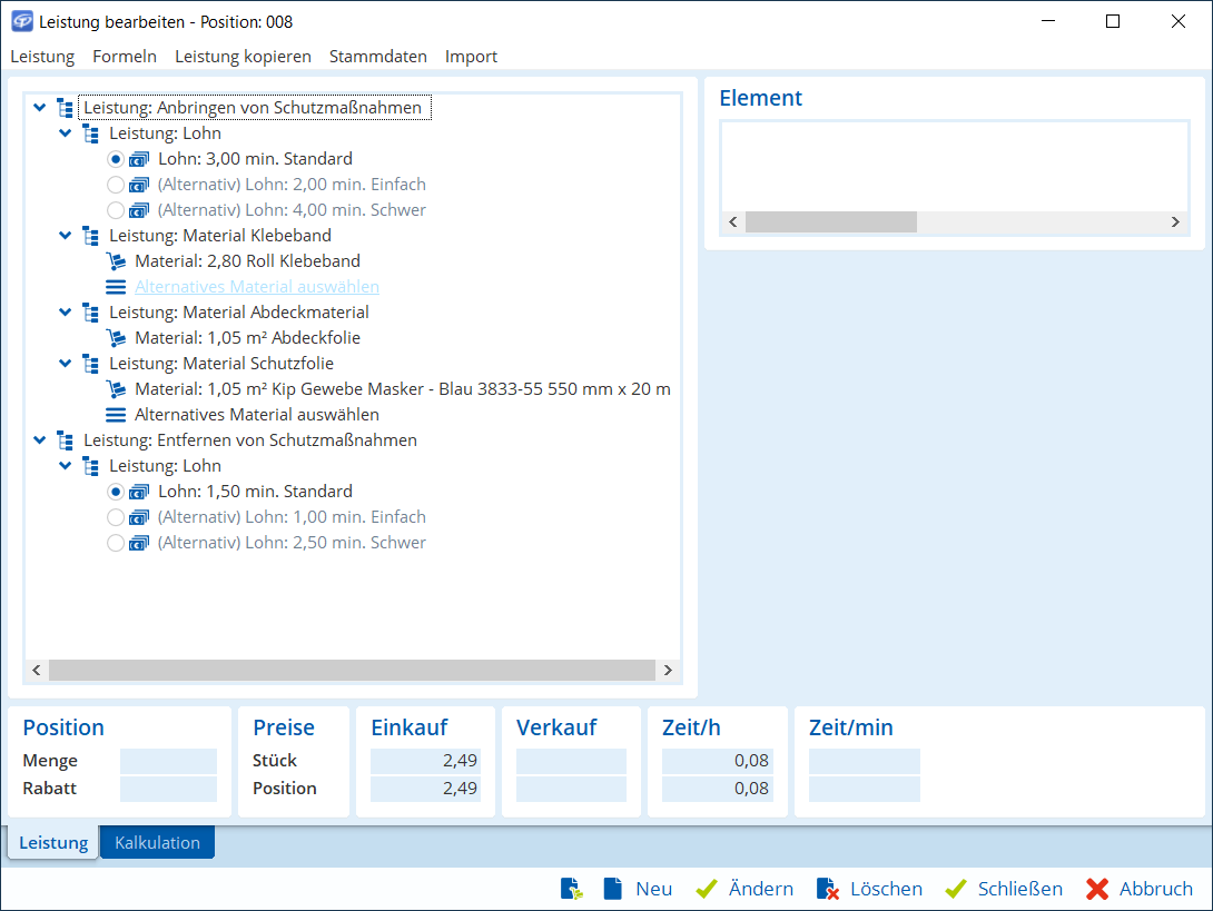 Nun haben Sie die Möglichkeit über die neue Schaltfläche Alternatives Material auswählen ein alternatives Leistungselement und direkt den gewünschten Artikel auszuwählen.