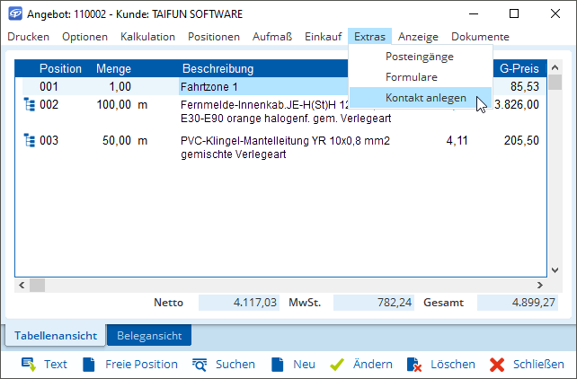Sie können in Angeboten und Belegen nun Kontakte anlegen. Dazu wählen Sie im Beleg den Menüpunkt Extras | Kontakte anlegen.