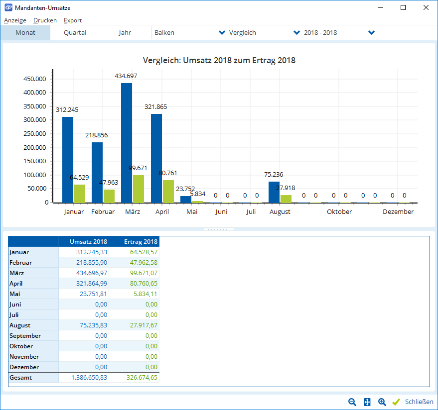Lassen Sie sich Ihre Umsätze noch komfortabler anzeigen: In nur einem Fenster können Sie bequem zwischen Monat, Quartal und Jahr hin- und herwechseln. Je nachdem, in welche Zelle der Tabelle Sie klicken, wird direkt das Diagramm entsprechend angepasst. Das Diagramm kann über das Menü Anzeige ein- oder ausgeblendet werden.