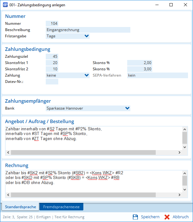 In den Zahlungsbedingungen haben Sie nun die Möglichkeit, zwei verschiedene Skontofristen mit jeweils unterschiedlichem Skontoprozentsatz anzugeben. So können Sie beispielsweise bei einer Zahlung innerhalb von 10 Tagen mehr Skonto gewähren als bei einer Zahlung innerhalb von 30 Tagen.