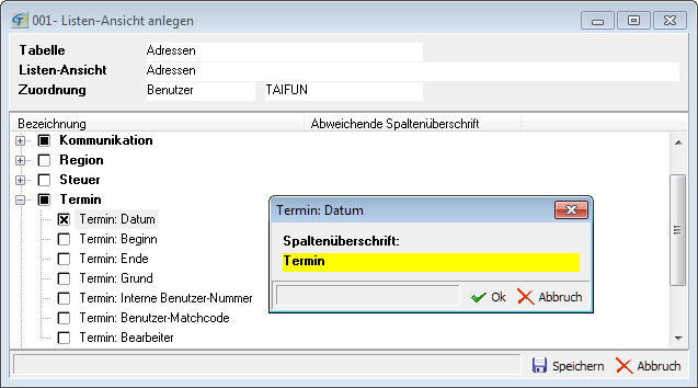- Listenansichten im Programm können jetzt individuell gestaltet werden. Sie können Datenfelder aufnehmen oder entfernen, so dass andere Spalten als im Standard sichtbar sind. Auch die Spaltenbeschriftungen können Sie ändern.
